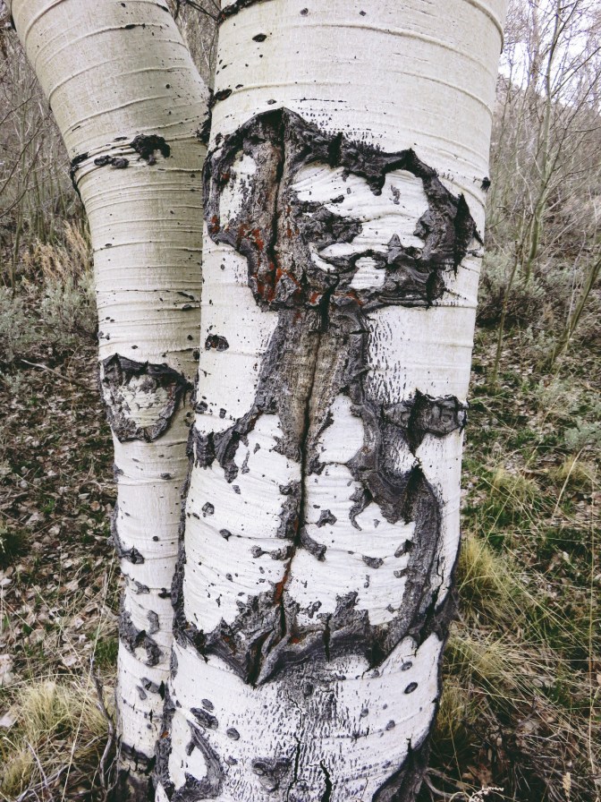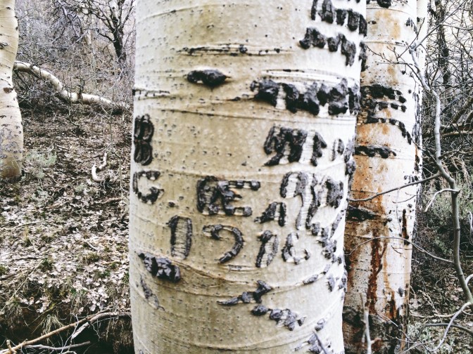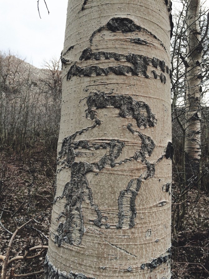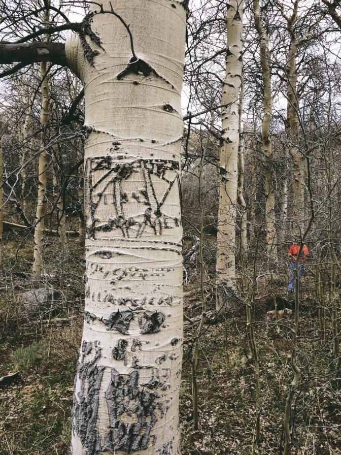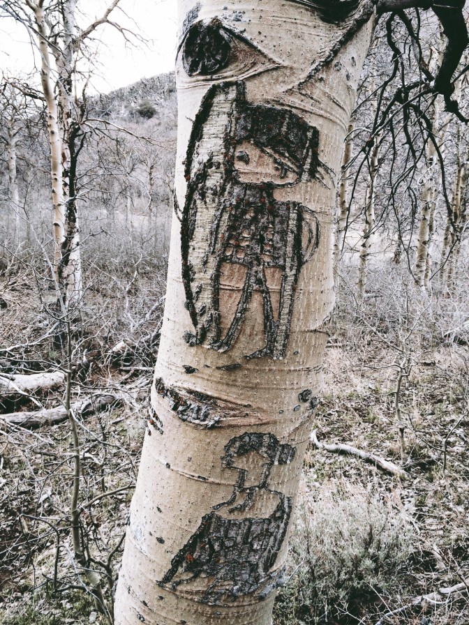 So you can imagine how surprised I was, when we got into the high meadows on an early spring before the trees have budded, to notice that many of the aspens had been carved. The earliest for-sure date we saw was 1916, but one that was very hard to read may have been from the 1800s. And there were lots of them, many women but other figures too, so old they were really hard to distinguish in many cases.