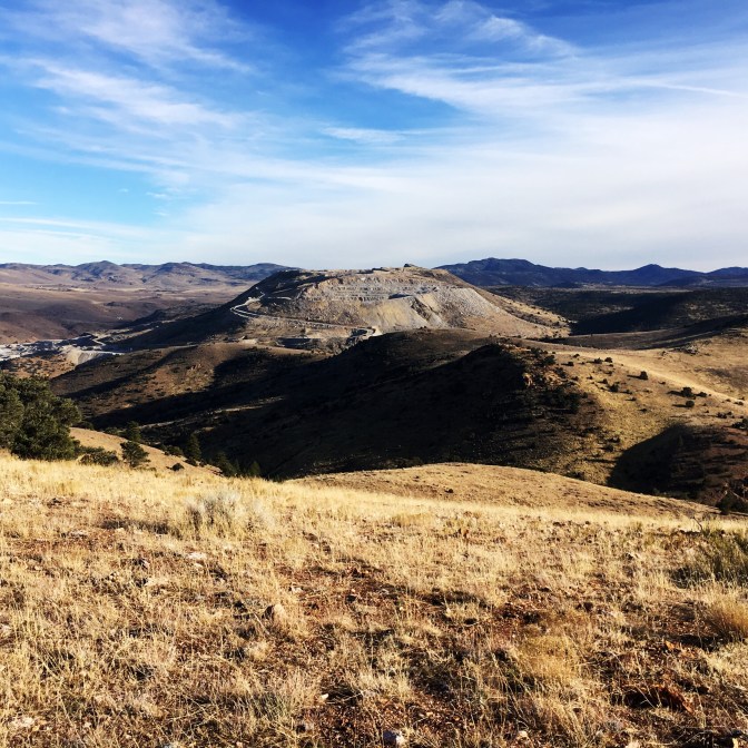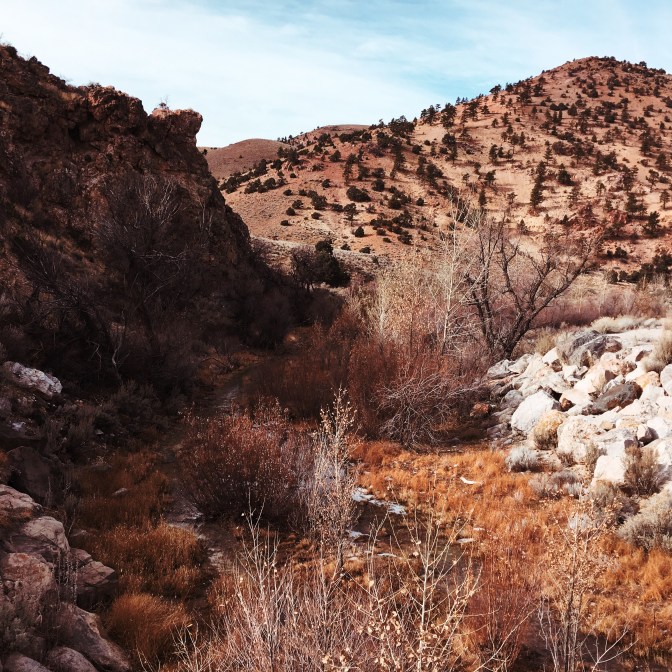 These hills east of Reno are the remains of volcanic activity that predates the rise of the Sierra Nevada, and the landscape would have then resembled the Cascades more than the current Virginia Range (more in my post on The Old Mother Who Sleeps and Wants to Be Left Alone ). The dominant plant and animal species came in waves: some “real” pine trees, the juniper and sagebrush, wild horses, later invasive species: cheat grass and mustard weed most notably. While I am walking across their slopes many jet planes, some obviously commercial, others more likely military, use the airspace above me to approach the Reno airport. There is day-long activity at the quarry that is Washington Hill. And there is much evidence of past heavy use: the remains of a stone house I see in the canyon bottom, a wide old road now an OHV path. At places I can almost see over to the Tesla Gigafactory. I crest over a hill and see in the canyon of the Truckee below me a place that was an important life source for native people. Then transformed into a major thoroughfare for the West: gold-seeking emigrant parties, the first transcontinental railroad, the first interstate all have used this narrow funnel into the Golden Land of California.