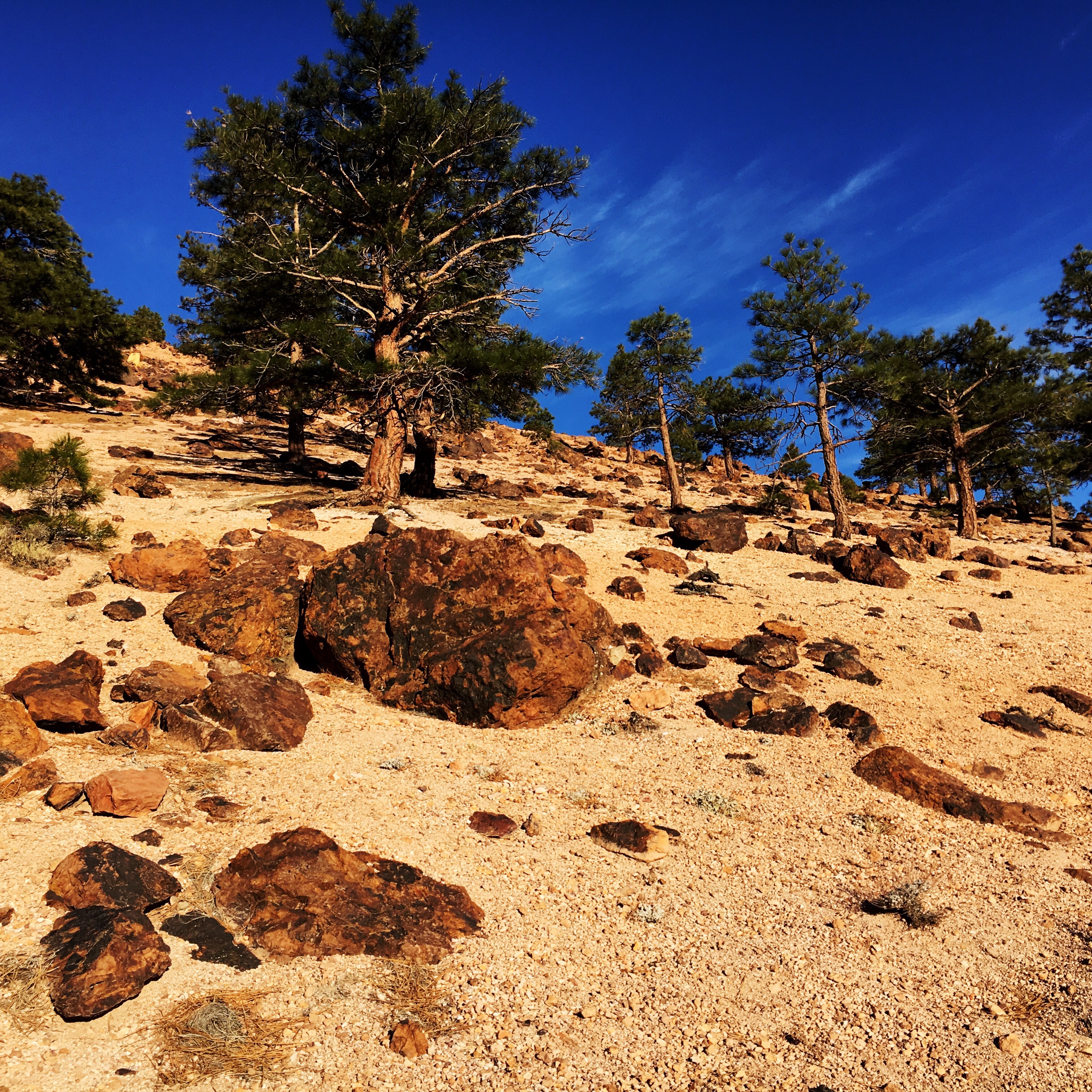 The scale of the landscape is dominated by the massive undertaking that scraped off the top of Washington Hill and that continues to haul it away for our purposes. A massive scale that is mirrored in the vistas of the river, of the sierra to the west, Clark Mountain to the east. Nearby rock formations, splashes of multicolored rock, pines spaced parklike in otherwise grassless volcanic parks all seem to be muted against the vastness of all else, and yet these are just little trackless mountains, blinks of the eyes on the interstates. Places to go through to get somewhere else. The juxtaposition is powerful.